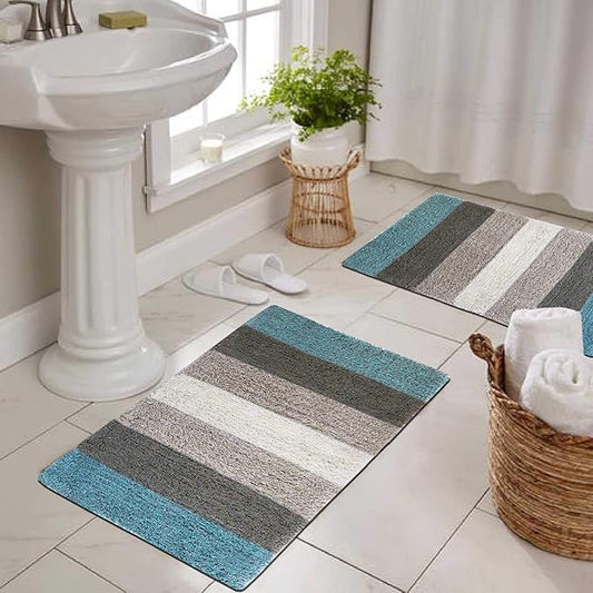 The Home Talk Cotton Stripes Bathmats Water Absorbent Runners Floor Mats Non-Slip Pack of 2 Beige Turquoise