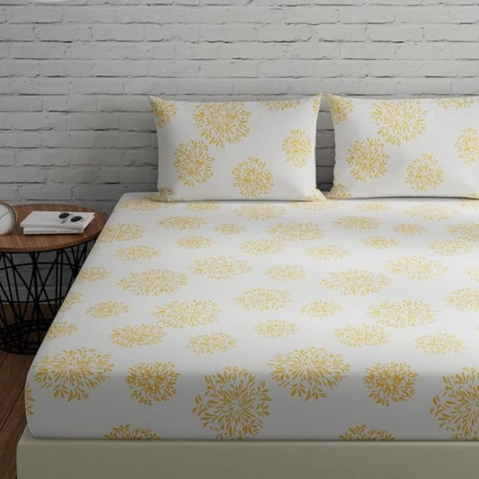 Huesland by Ahmedabad Cotton 144 TC Cotton Bedsheet for Double Bed King Size with 2 Pillow Covers | White (Yellow Print)