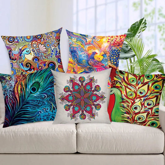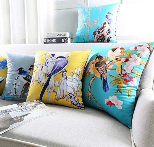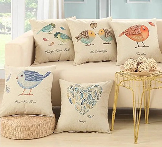 Aerohaven Set of 5 Nature-Inspired Bird Print Cushion Covers Cotton Linen Throw Pillow Covers