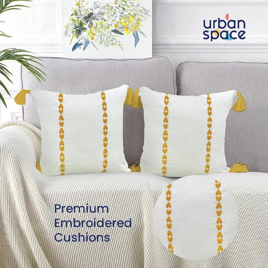 Urban Space Embroidered Cotton Cushion Cover Set of 2 Cushion Covers for Sofa, Bedroom, Living Room Vintage Braid Yellow