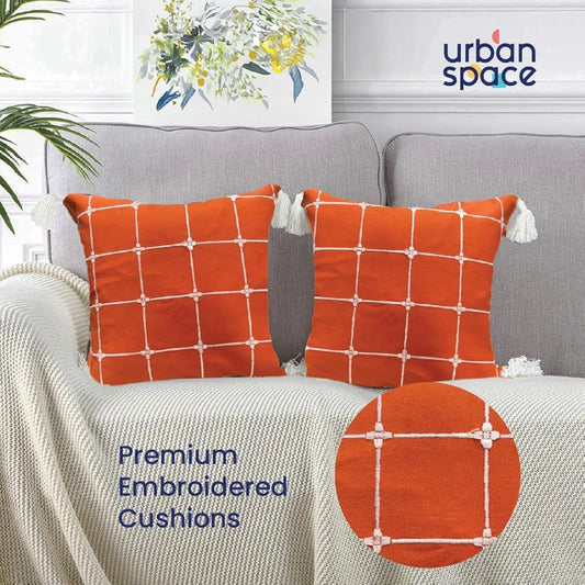 Urban Space Embroidered Cotton Cushion Cover Set of 2 Cushion Covers for Sofa, Bedroom, Living Room Colour Aura Checks Orange