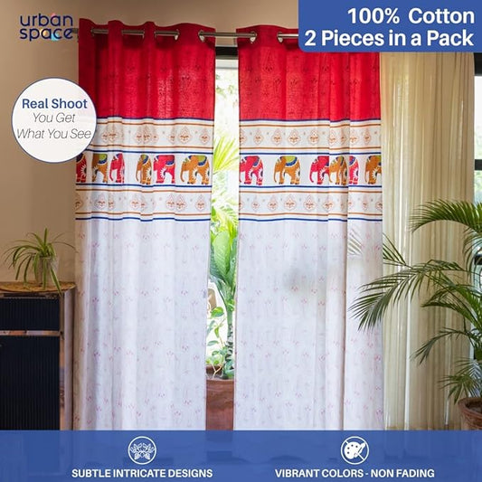 Urban Space Cotton Printed Semi Sheer Curtains For Door Set Of 2 With Eyelets And Tieback (Colour Panel Elephants Red)