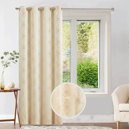Urban Space Blackout Curtains for Living Room, Gold Foil Printed Luxurious Blackout Decorative Curtains Eyelet with Tieback, 1 Piece Diamond Beige