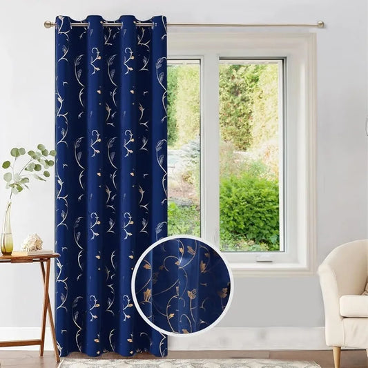 Urban Space Pure Blackout Opaque Curtains For Living Room, Gold Foil Printed Luxurious Blackout Opaque Curtains Eyelet With Tieback, 1 Piece Pack, Vine Navy Blue
