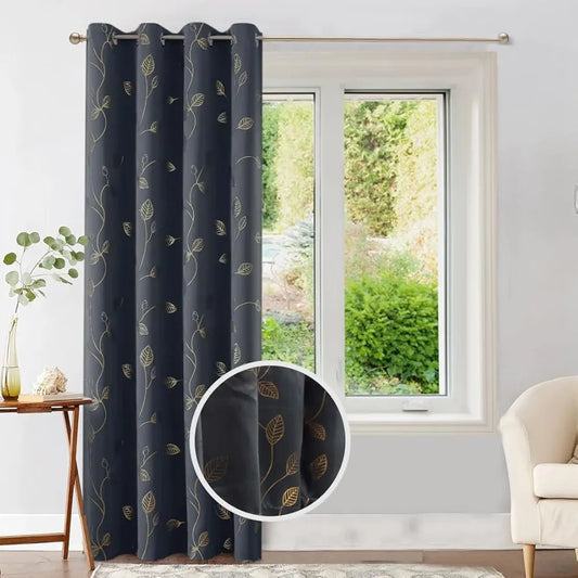 Urban Space Blackout Curtains for Living Room, Gold Foil Printed Luxurious Blackout Decorative Curtains Eyelet with Tieback, 1 Piece, Leaf Grey