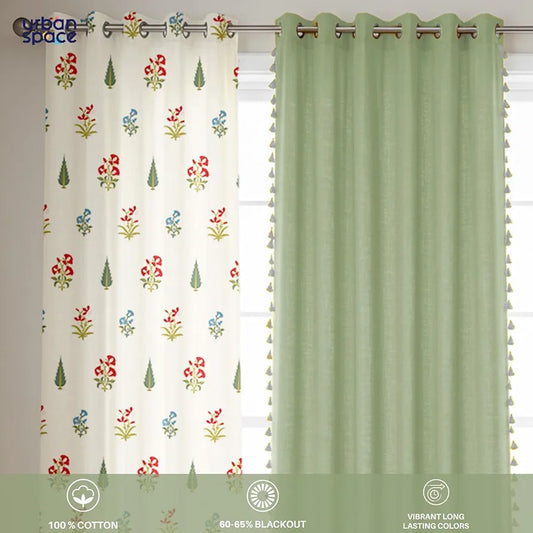 Urban Space Floral Cotton Curtains For Door, Combo Set Of 3 Room Darkening Curtains Tieback & Eyelets High Garden Red & Aura Green