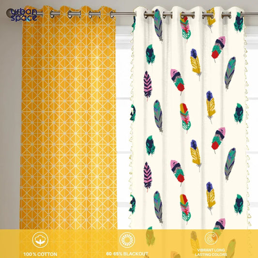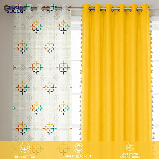 Urban Space Cotton Curtains for Door Set of 3 Curtains for Home Decor Mosaic Yellow and Blue & Aura Indigo