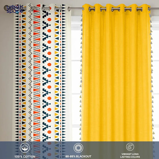 Urban Space Geometric Cotton Curtains For Door Set Of 3 Curtains For Home Decor Ikat Orange & Aura Yellow