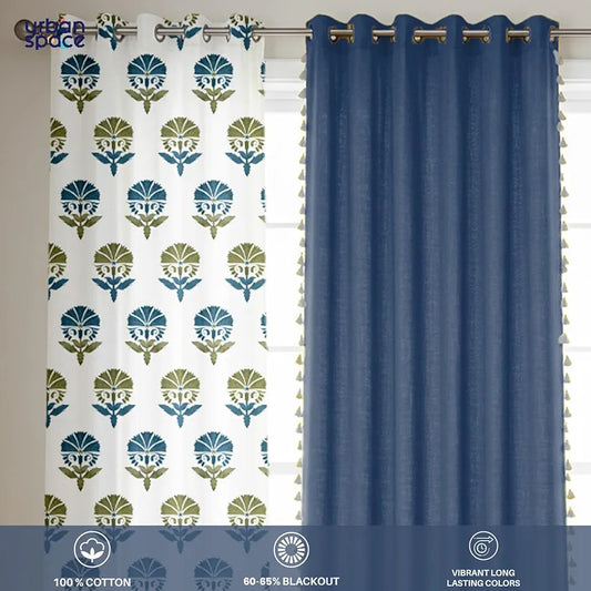 Urban Space Floral Cotton Curtains For Door, Set Of 3 Curtains For Home Decor Mosaic Yellow and Blue & Aura Indigo