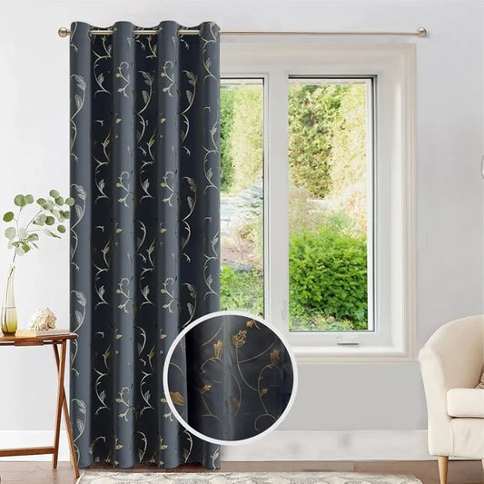Urban Space Pure Blackout Opaque Curtains for Living Room, Gold Foil Printed Luxurious Blackout Opaque Curtains 1 Piece Pack Floral Vine Grey