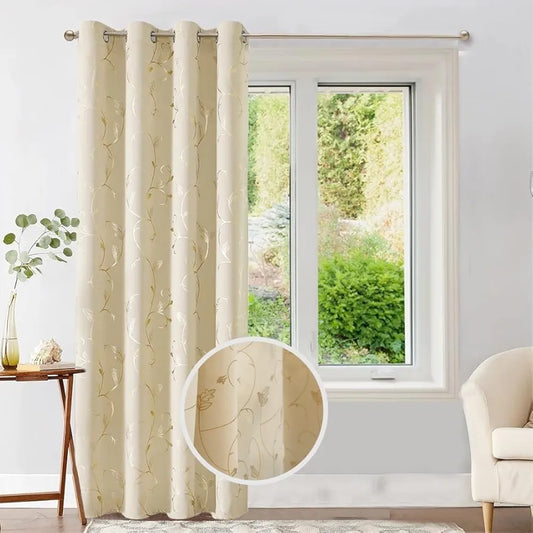 Urban Space Pure Blackout Opaque Curtains For Living Room Gold Foil Printed Luxurious Blackout Opaque Curtains 1 Piece Pack, Floral Vine Beige