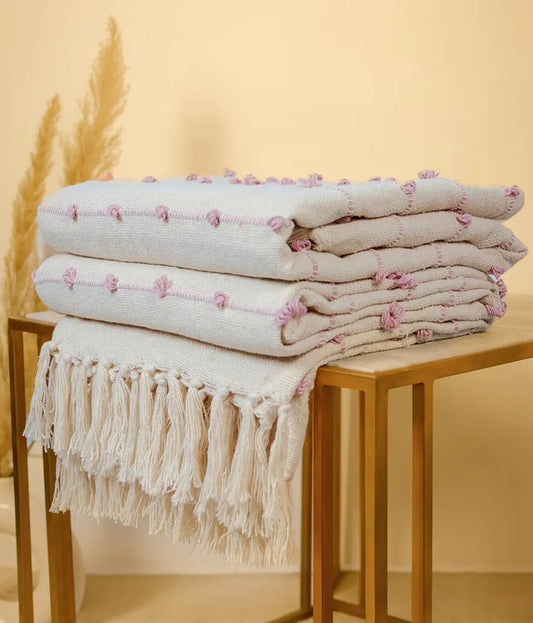 Sajavat Home Hand Knitted Pure Cotton 3 Seater Sofa Throw Beige & Pink