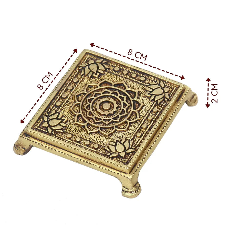 - Square Brass Pooja Chowki Weight : 475g, Length : 8cm, Width : 8cm, Height : 2cm Metal : Brass.