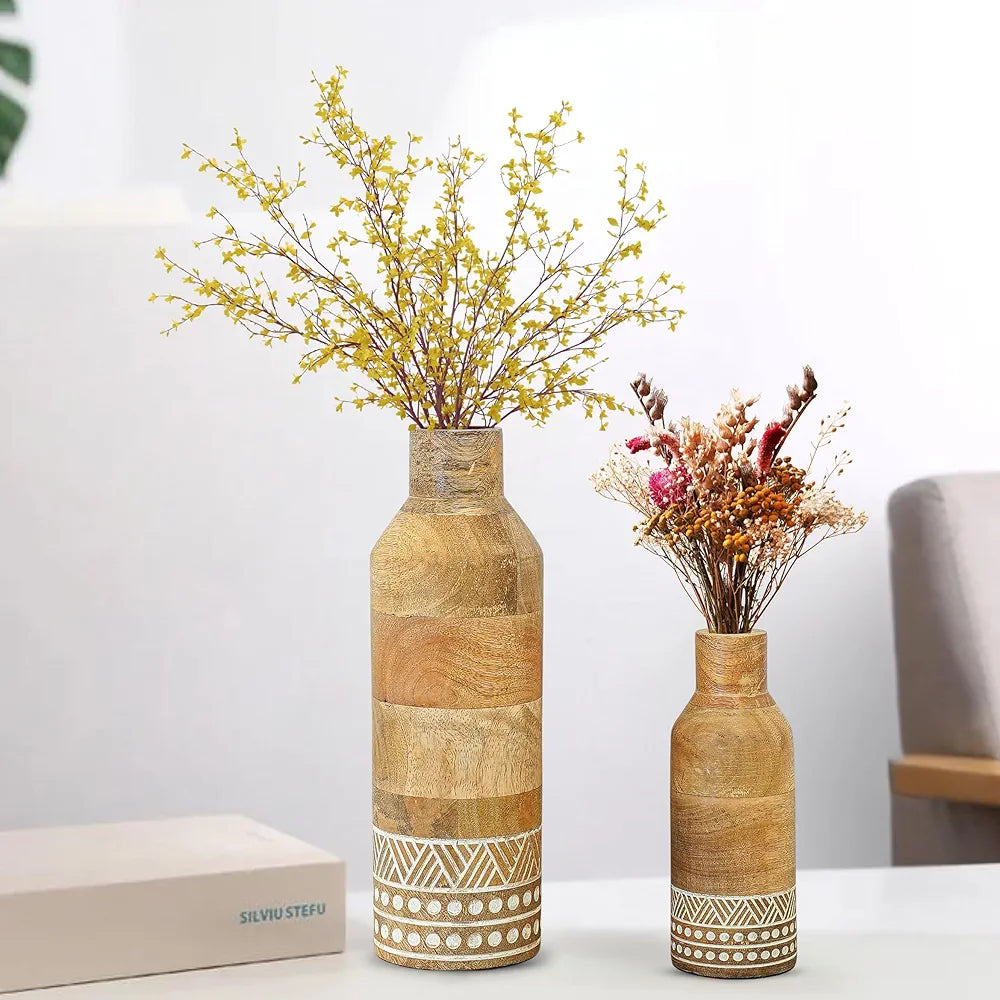 - Handcrafted Excellence: This Beautiful Bottle-shaped Mango Wood Vase Set exudes sturdy and natural charm, meticulously handcrafted by skilled artisans in India. For maintenance, simply use a dry cloth to clean off dust. Our boho engraved vases for decor are made with Mango wood and carefully polished by skilled artisans to ensure long-lasting durability and resilience.