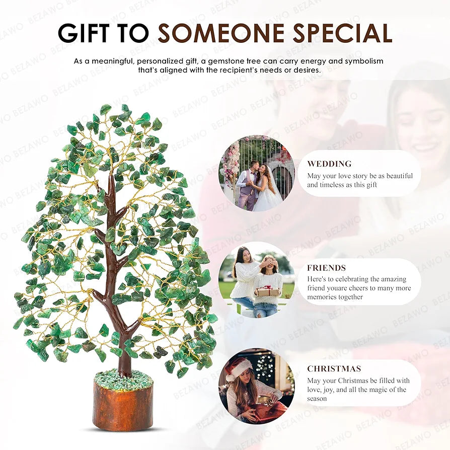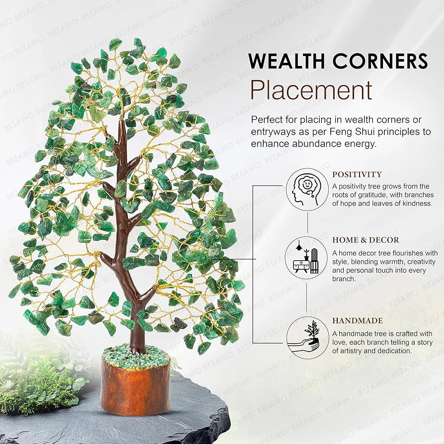 - GREEN AVENTURINE GEMSTONE MONEY TREE: This Feng Shui Green Aventurine Gemstone Money Good Luck Tree of Life (Golden Wire) Size: 10-12 Inch, Handmade In India. It is also known as Wealth or Money Tree as it can help to invite Wealth Luck based on its placement, After all, the tree symbolizes stability, growth, as well as a long life blessed with abundance. This tree is not a person per say but benefiting everyone in the premise.