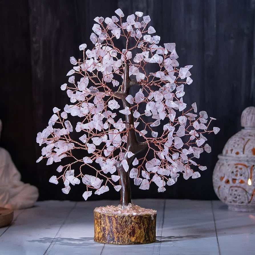 - ROSE QUARTZ CRYSTAL TREE: Handmade 10-12 inch Feng Shui rose quartz Gemstone Money Tree represents self-reflection, prosperity, calmness, balance, optimism, and creativity. Used for healing and enhancing the environment, it brings good luck, positivity, and prosperity to your surroundings.
