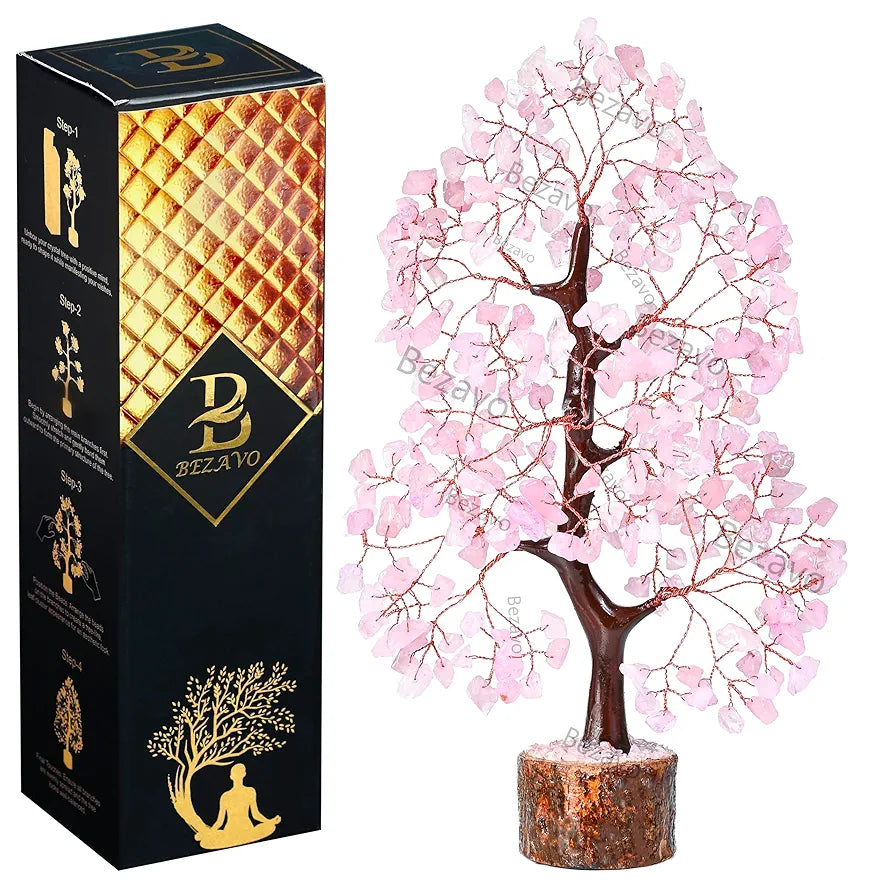Bezavo Rose Quartz Crystal Feng Shui Tree Silver Wire