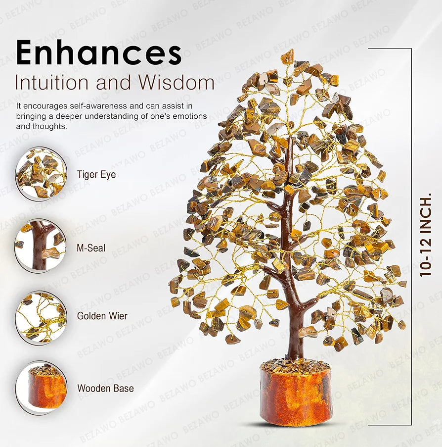 - TIGER EYE GEMSTONE MONEY TREE: This Feng Shui Tiger Eye Gemstone Money Good Luck Tree of Life (Golden Wire) Size: 10-12 Inch, Handmade in INDIA, Money tree brings good luck, prosperity, provides positivity and enhances the power of your surroundings. Crystals can be used for healing or environmental enhancement, Gemstone Tree represents self-reflection, prosperity, calmness, balance, optimism, and creativity.