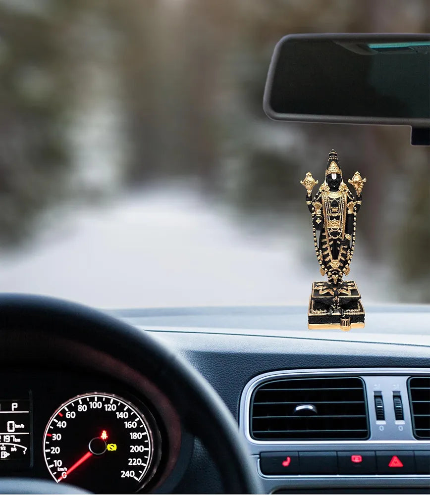 - Tirupati Balaji Size: Black terracotta Lord Tirupati Balaji idol with intricate golden jewelry work, The idol measures 5.1 inches in height, 2 inches in width, and 2 inches in length, with a weight of approximately 110 grams, making it perfect for home dcor, office, and car dashboard spaces.