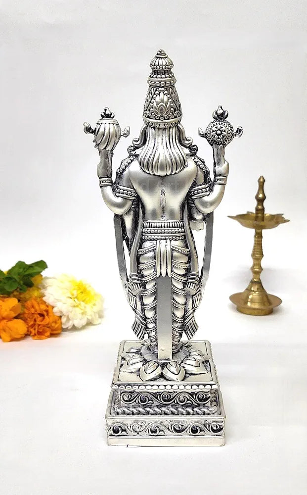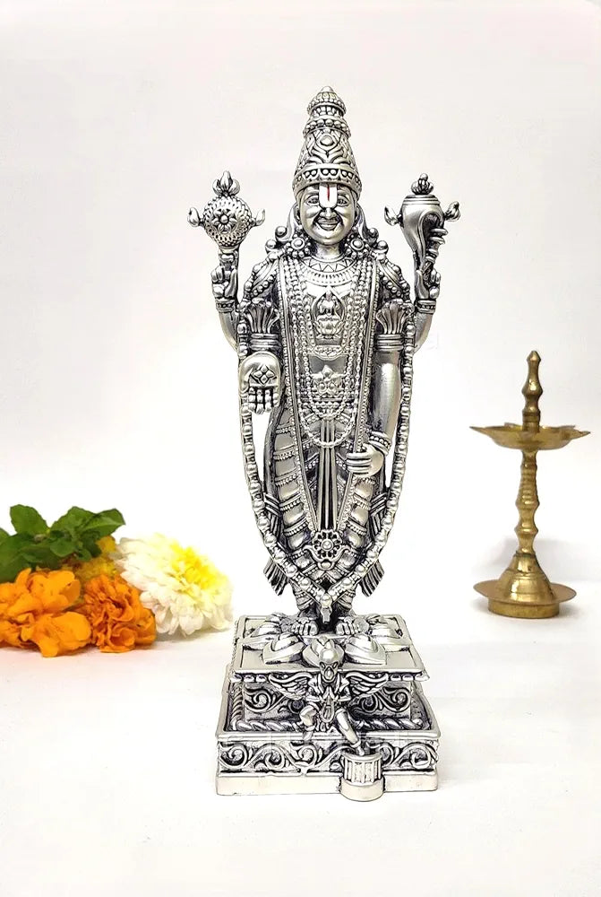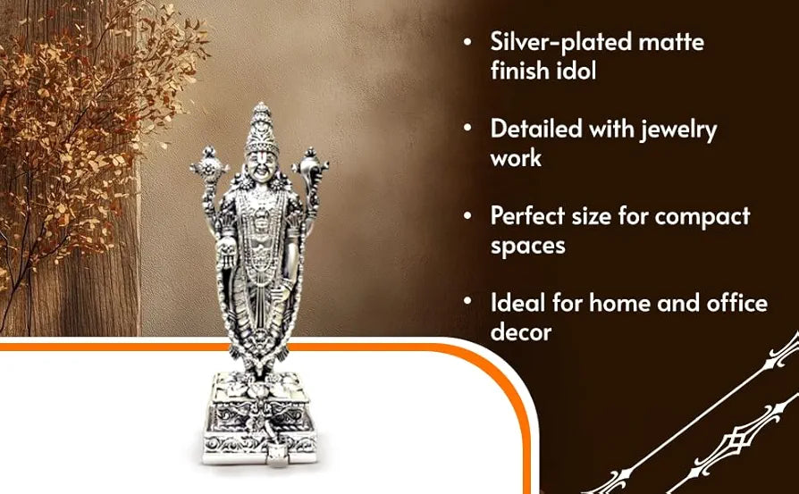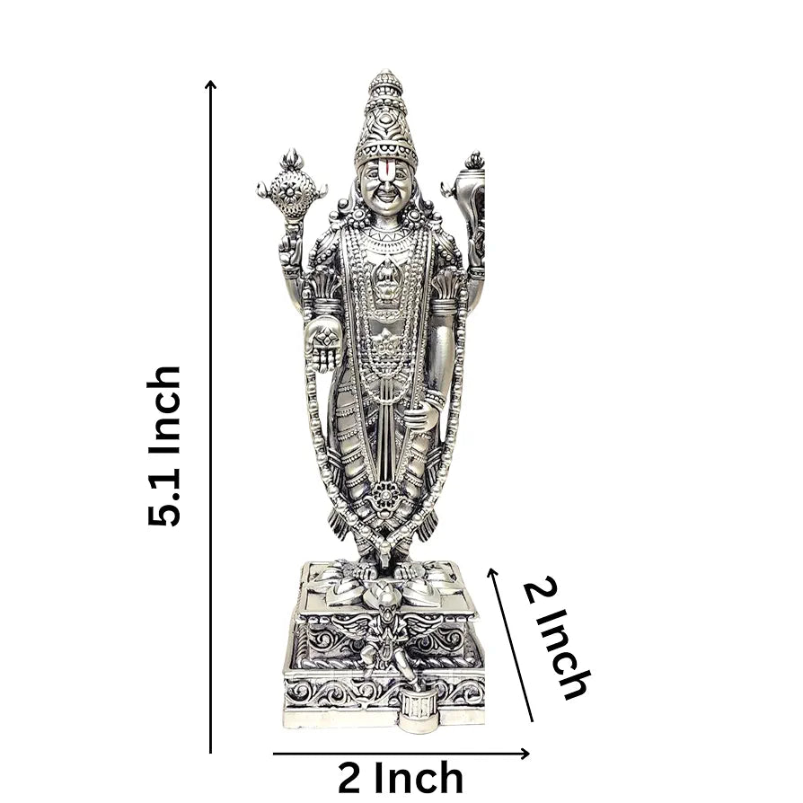 - Tirupati Balaji Size: Silver Plated Matte Lord Tirupati Balaji idol with intricate silver jewelry work, The idol measures 5.1 inches in height, 2 inches in width, and 2 inches in length, with a weight of approximately 110 grams, making it perfect for home dcor, office, and car dashboard spaces.