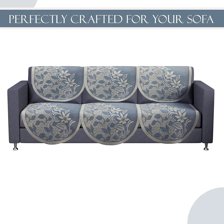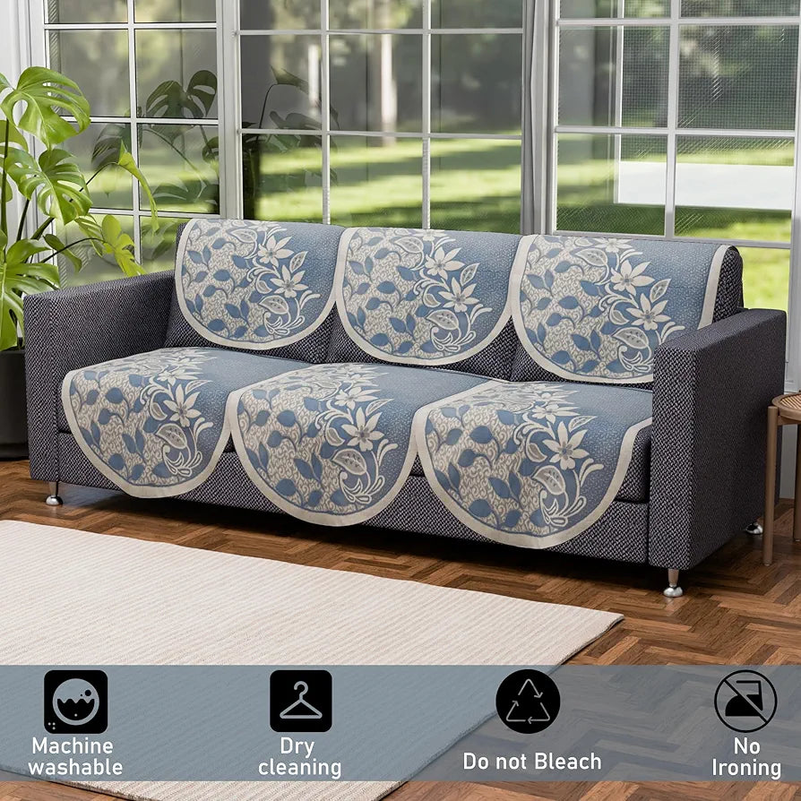 - Package Contains - 10 Pieces Sofa Cover Set | 5 Seater | Color - Floral Design - Blue | Material - Net + Cotton Blend Fabric | Product Dimensions - 3-Seater : 171 cm x 76 cm x 1 cm | Single Seater : 76 cm x 57 cm x 1 cm
