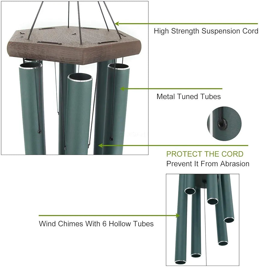 - Wind chime has deep tone & relaxing tones .it have 6 hollow metal tubes tuned tuned to the scale of B,it has S hook for indoor and outdoor use