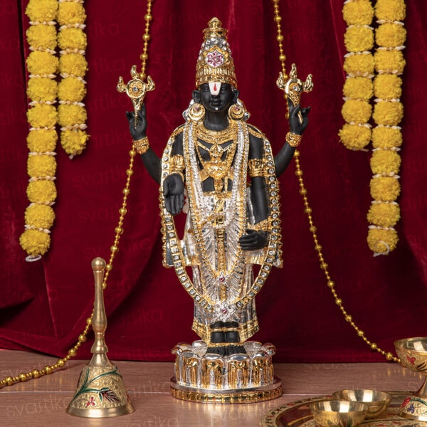 - The golden hue symbolizes prosperity and divinity, while the silver accentuates purity and spirituality. Elevate your spiritual practices and immerse yourself in the divine energy that radiates from this standing idol. Perfect for both gifting and personal use, this Tirupati Balaji idol will be a cherished possession that inspires devotion and adoration.