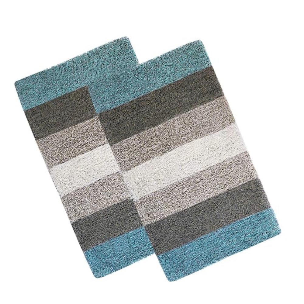 The Home Talk Cotton Stripes Bathmats Water Absorbent Runners Floor Mats Non-Slip Pack of 2 Beige Turquoise
