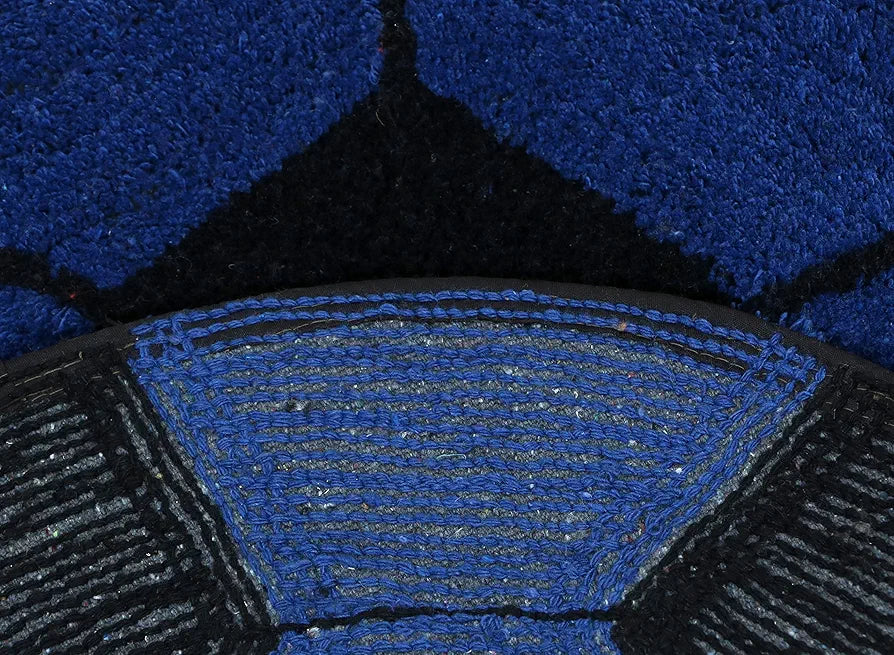 - Football-Themed Design – Attractive blue and black round rug shaped like a football.